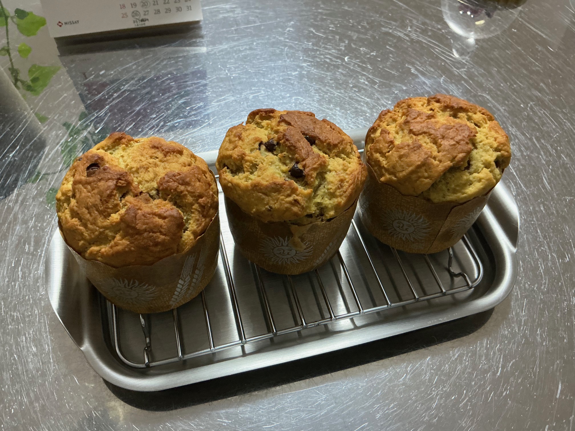 こちらは3度目の挑戦で、 なかなかおいしく完成した 「バナナチョコチップマフィン」です